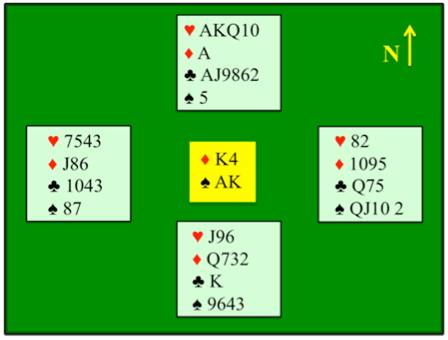 Toisessa pöydässä etelä antoi samat hertat ja ristin yli, mutta ei laittanut kortteja sekaisin. Tästä Pohjoinen ajatteli Etelällä olevan jäljellä ristiä, eikä pitänyt tarpeellisena palauttaa pikkuristiä, antoi Etelälle ♦A:n ja maalasi 6 grandia. Tässä pöydässä Itä jopa koputti ilman mitään edellytyksiä ja aloitti ♠Q:lla. Etelä sai omat patansa ja ruutunsa, muttei päässyt kiinni Pohjoiseen ja tuloksena kaksi pietiä. Ristiyhteydellä tulos olisi ollut ylitikki ja loistava pistekertymä!